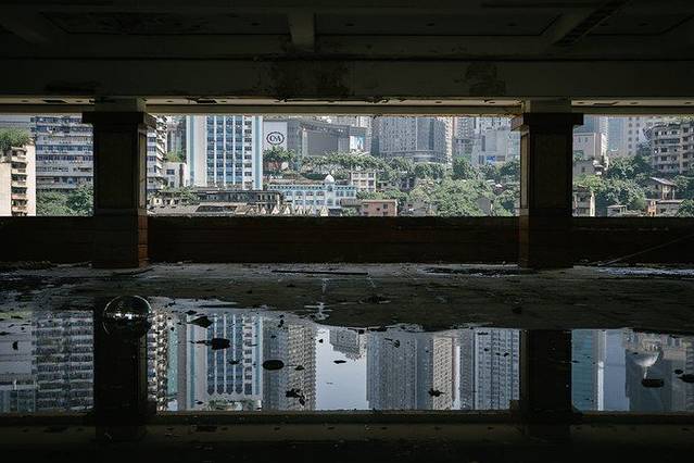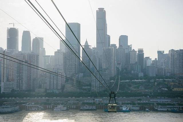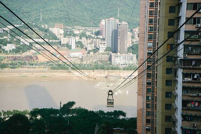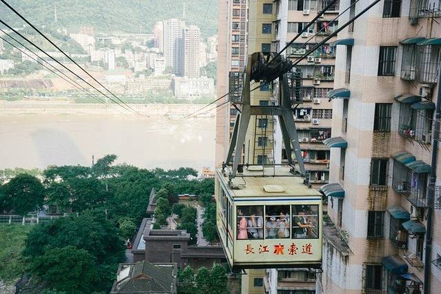 轴轮慢慢转动,带动着钢索,钢索吊着铁皮车厢,开始像长江的中心划去,这工业时代的遗址,令人直观地叹服着人类文明的智慧。车厢渐渐远离楼群,渝中半岛的钢筋森林在午后的太阳逆光中只剩轮廓。