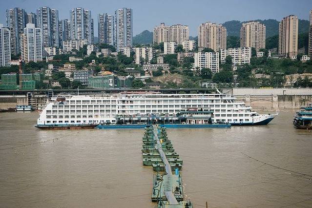 重建中的朝天门区域是一大片的工地,前往朝天门码头的路并不好走。曲曲折折地终于走到了长滨路,长滨路下面是一级一级的水泥阶梯,阶梯下面是黄水滚滚的长江,长江水面停着这一艘艘大小不一的轮船,每个轮船都有一条长长的通道直通江岸。一艘轮船就是一个码头,这里就是朝天门码头。