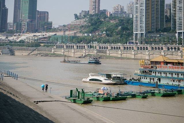 观看洪崖洞全貌的最好地方在嘉陵江的对岸。在重庆的第二天傍晚,从大剧院交通轨道站出来,到了江边。初夏八点天黑的重庆,阳光到了六七点还是相当的明媚。阳光晒着嘉陵江上,碧波荡漾。阳光照在洪崖洞吊脚楼的吊脚楼上,木质的外墙有一种古朴的气息。阳光反射在洪崖洞背后拔地而起的高楼大厦,光彩夺目。好一个朝气蓬勃的重庆森林。