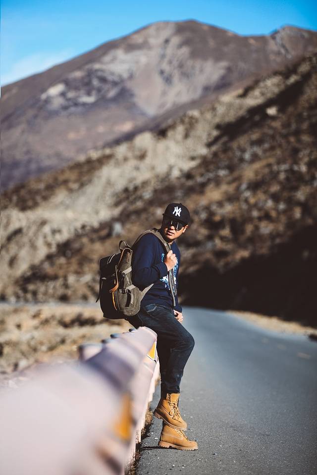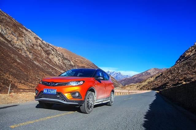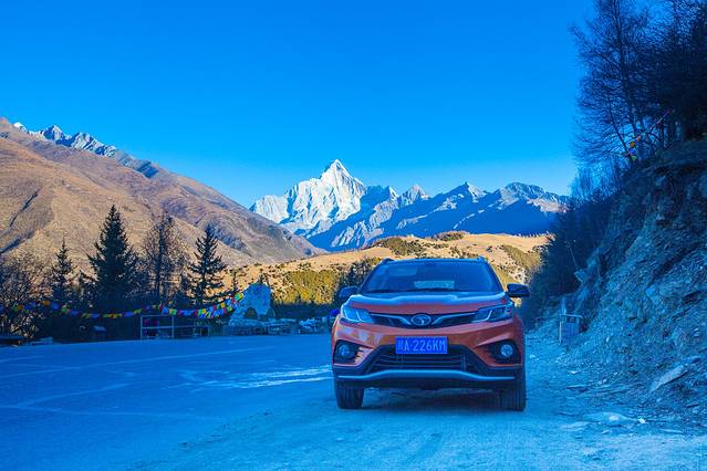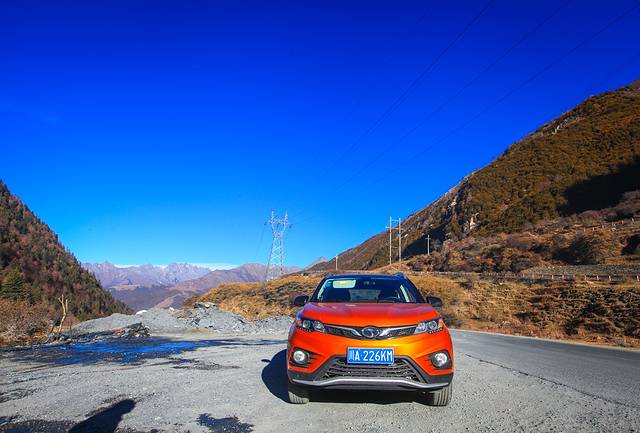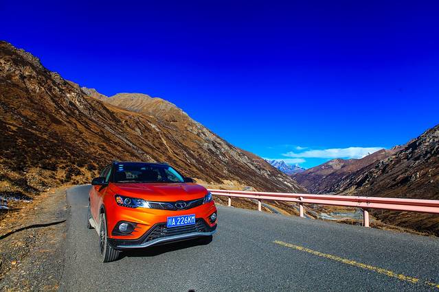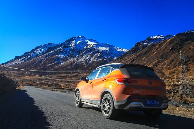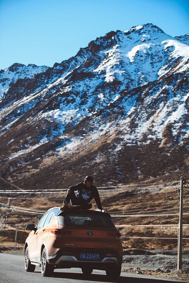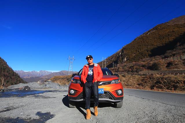 东南DX3的橙色我觉得蛮适合拍照的,特别是上高原后,在蓝天之下橙色非常出片。我还专门选了一件颜色相近的橘色羽绒服来搭配。