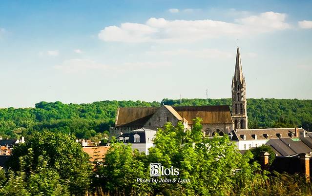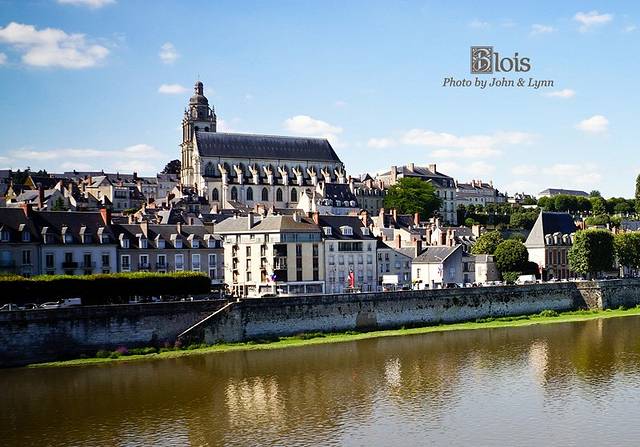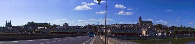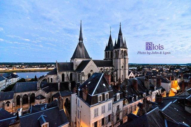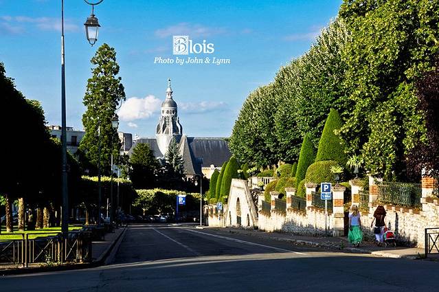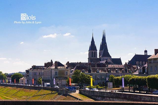 从卢瓦河上的Jacques Gabriel 大桥看右岸的布洛瓦老城区全景,左侧的三座尖塔所在是St Nicolas 教堂,大桥正对的是Danis Papin大街,右侧的制高点就是St Louis主教教堂。