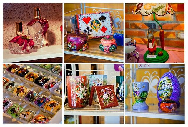 各种手绘的木质工艺品、玻璃香水瓶、抽象图案的戒指等等
