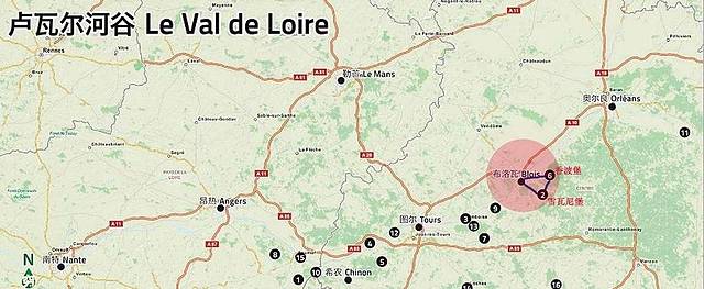 巴黎有多个中心火车站,去卢瓦河谷的出发车站是奥斯特里茨车站(Gare de Paris-Austerlitz)。借用网上的地图,可以看到十几个主要城堡散落在河谷的不同地区,在铁路沿线的几个小城中,图尔是最大的交通枢纽和旅游集散地,周边城堡也相对集中,所以大部分游客会选择从巴黎到图尔落脚,从图尔出发去参观城堡。(卢瓦河谷城堡群中文官方网站:http://loirechateau.cn/)
