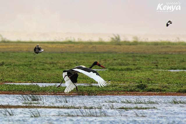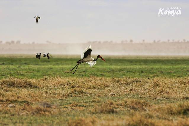 鞍嘴鹳Saddle-Billed Stork因嘴上的黄色肉垂酷似马鞍而得名,这只鞍嘴鹳正带着它的宝宝们练习飞行。