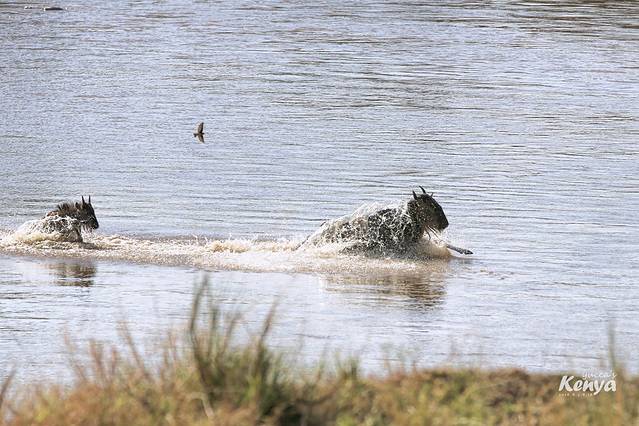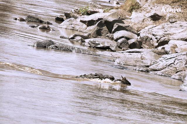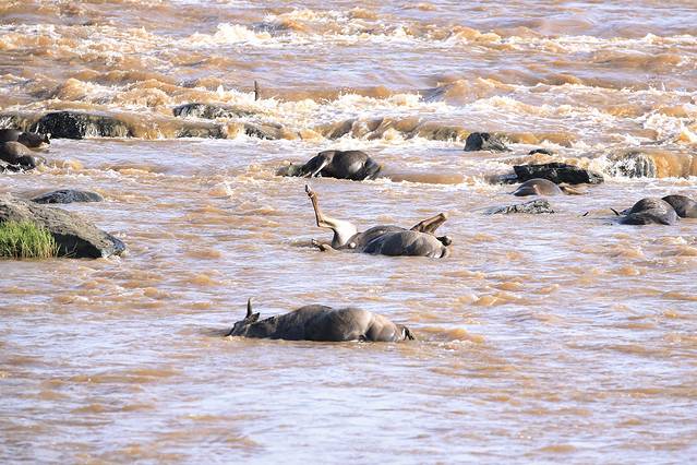 乱石堆边十几具角马尸体浮沉,队列旁斑点鬣狗环伺,头顶兀鹰盘旋,不到两个小时,先后七、八只角马伴随唏嘘声在我们眼皮底下消失,被拖入马拉河底。