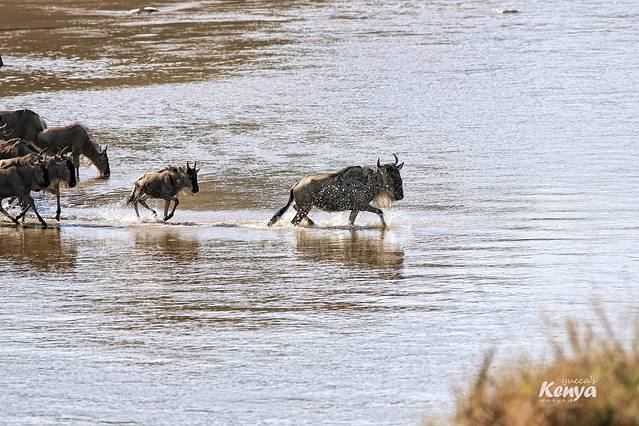 在马拉河边,我们又花了数小时蹲守角马过河,差点半途而废,角马们在距离300米的两个过河点之间来回溜达,最后居然同时过了河。可惜我们意志不坚,跟着角马摇摆不定,没有把握到最佳的观看位置。Allan童鞋又生生给我们上了一课:相信判断,多点耐心。