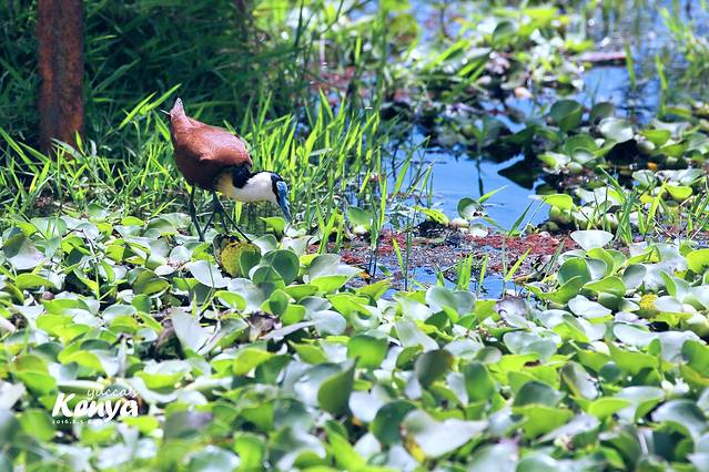 非洲水雉African Jacana,和其他雉鸻一样腿很长,脚趾巨大,是比较容易辨别的水鸟。以昆虫为食,捕捉水生昆虫的幼虫、小螃蟹、蜗牛,也吃植物的种子。