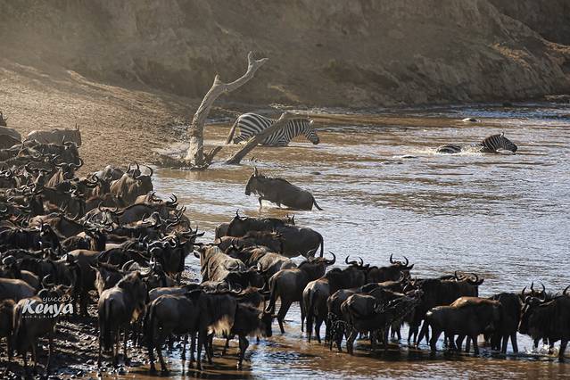 对岸又来了两只斑马,被角马围在中间特别醒目,它们好像在开动员大会:我们的同伴都已经安全过去了,大家就不要再犹豫了!