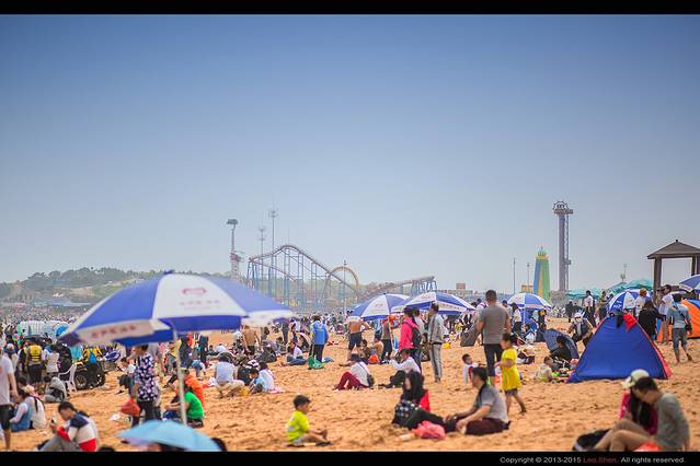实际等你到达沙滩看到的画面是这样的,不能说不计其数,起码也是数以万计的游客在此,可以见金沙滩无论在黄岛还是在青岛的地位都是数一数二的,海滩上的游乐大型游乐设施也很多,建议尽量避开节假日带孩子来玩会很开心,如果是黄金周这样的日子,呵呵,也只能看看海了。