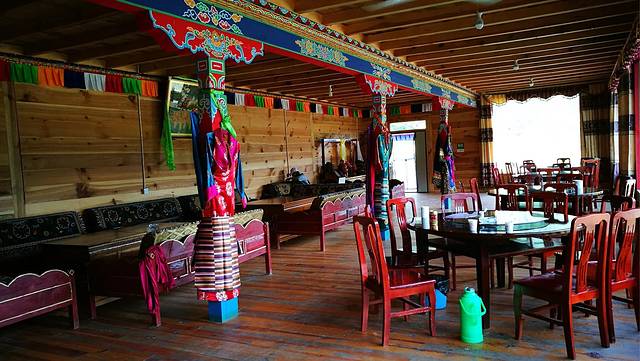 不过早上也是早早的起床了,然后藏族老板呢,拿着一个鼓,在左摇右摆的敲,然后念经。