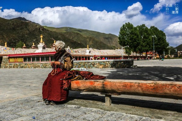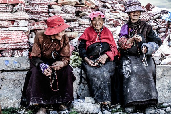 几位老者手持念珠于玛尼石堆旁坐下,她们笑的自然、自在,全无烦恼。