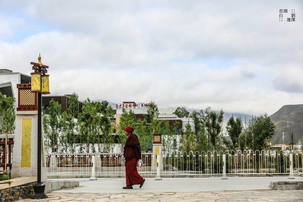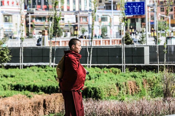 偶然路口经过一位藏民同胞,他走的很慢,神态悠闲自在,手里握着小袋子,许是刚买的早点。他转过头望向我,摆了摆手而后继续他前行的步伐。