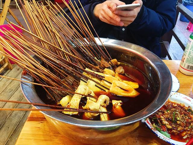 推荐宽窄巷附近的串串香,每天下午5点营业,记得一定早去1小时,4点就去那里排号!晚了就要等N久!人非常多,味道不用多说。噢……对,名字叫冒椒火辣,以及导航一下吧