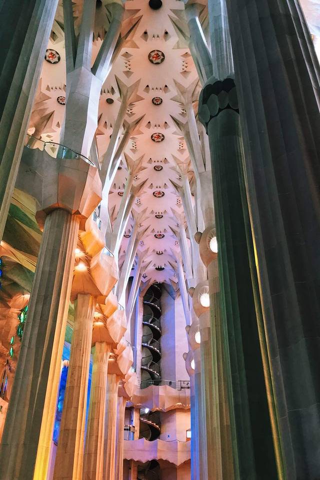 內部的立柱是高迪獨特的設計作品。除了分叉以進一步支撐重量,它們千變萬化的表面紋理是多種幾何圖形拼合的結果。