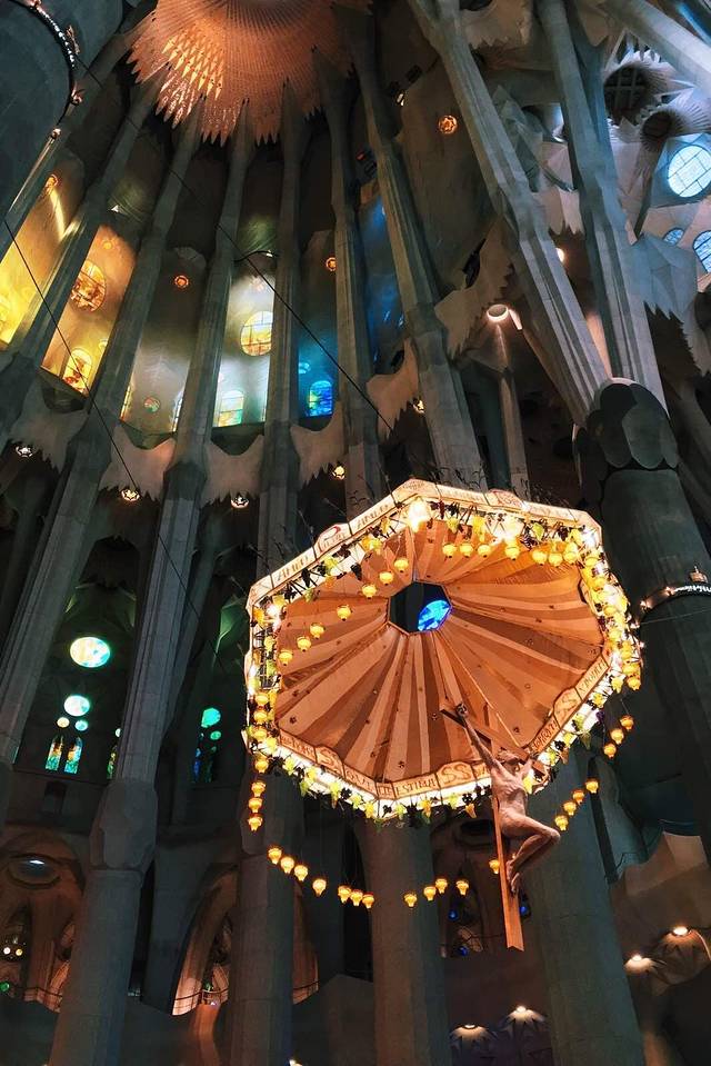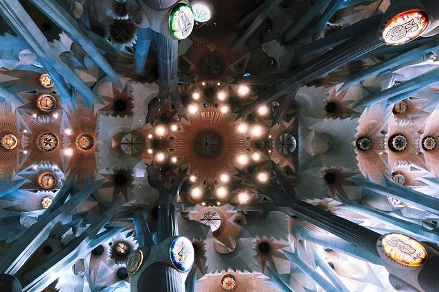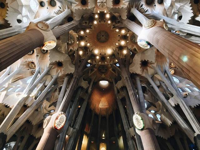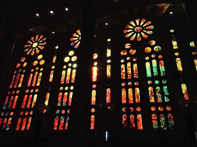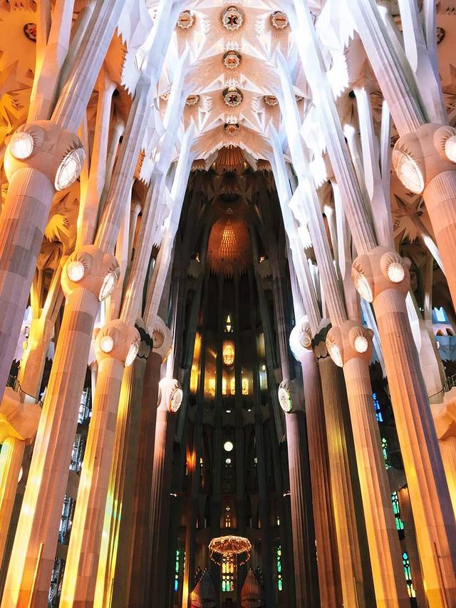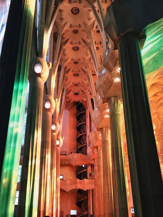 高迪巧妙的利用光效增強了圣家堂的感染力于莊嚴感。他曾說色彩是生命的動人之處。走進圣家堂,感覺好像到了一個森林。樹杈般柱子,陽光透過彩色玻璃倒映在柱子上的七彩……