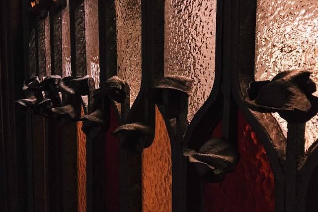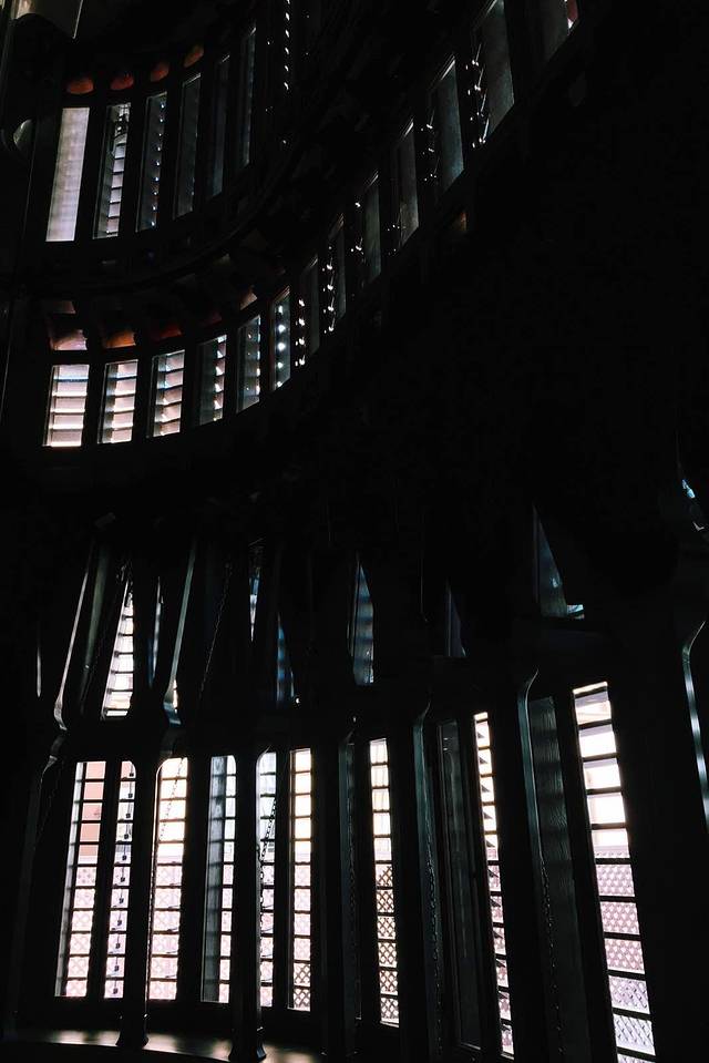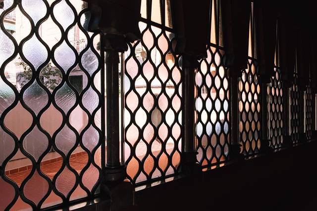 這裡幾乎每扇門和窗框都有色彩繽紛的玻璃泡泡,陽光射進房間時,這些小泡泡一來可以過濾掉部分西班牙熱情的陽光,二來經過多彩泡泡映射進房間的陽光也會被改變顏色。這是高迪設計的光與色彩的遊戲,在圣家堂的創作中更是被使用到了新的高度。