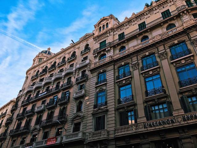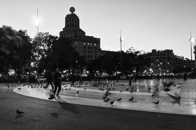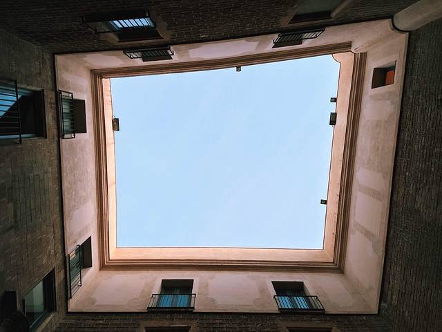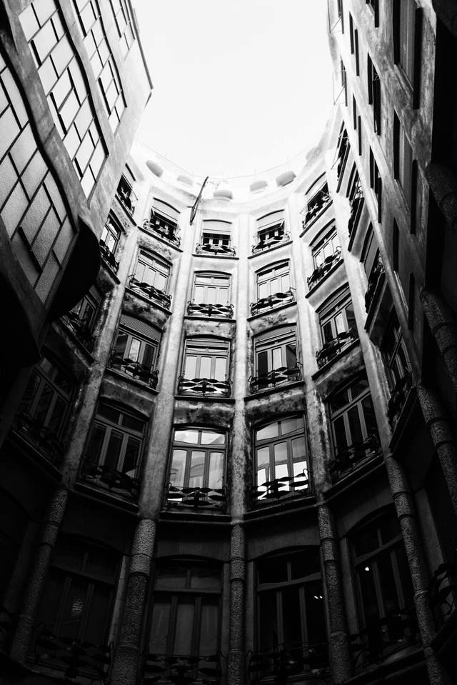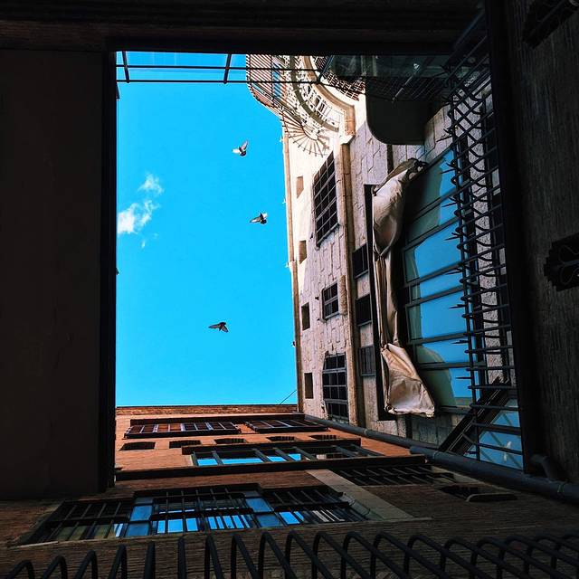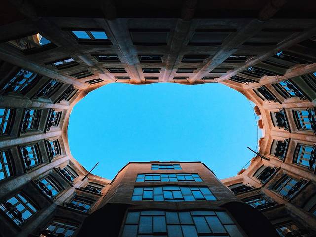 巴塞羅那的很多建築都是中空的,站在庭院中間,可以看到天空飛翔的鴿子。