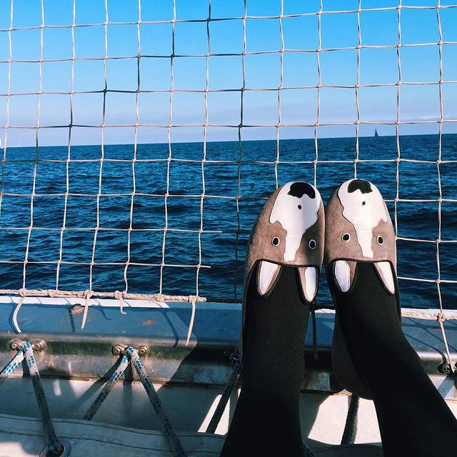 站在甲板上,一個西班牙船夫熱情招呼我站到中間的網上。看看網下白色的浪花和藍色的海水,有點擔心。他自己走到網上躺下幫我示意很安全,於是剩下的行程,沒有離開這張網。