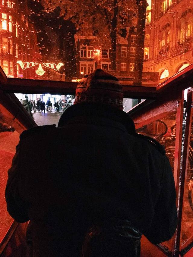 離開梵高博物館,天色已暗。阿姆斯特丹計程車少的可憐,優步沒車,身上沒零錢坐公車……被困在了博物館廣場。好在發現了這個奇怪的人力車。聊天得知車主是加拿大人,因為喜歡荷蘭的自由所以來這裡定居。他得意的說這個紅色小鐵皮車是他自己在中國用淘寶買來的零部件自製運過來的。傍晚降溫很冷,他身著棉衣頭戴毛帽,卻穿了條短褲,另類的時尚。