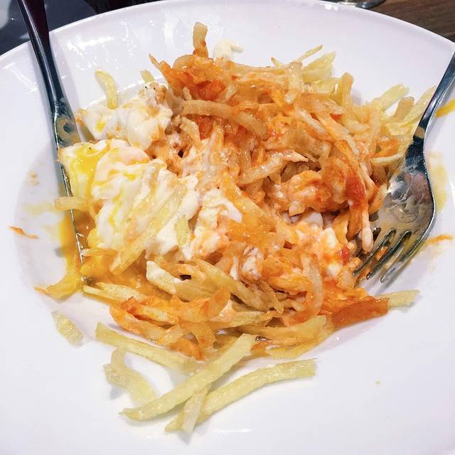 就在蘭布拉大道上的一家tapas老店。因為不到六點就到了,所以幸運的沒有排隊就直接入座了。店內裝修富麗堂皇,座位很多,服務員也很熱情。最喜歡Cabreaos Eggs style,其實就是細薯條、莎莎醬和一個半生的煎蛋,可在上海的西班牙餐廳就是吃不到。雖然好吃,可西班牙小吃不是油炸的就是搭配很多醬料,很容易就膩住了。
