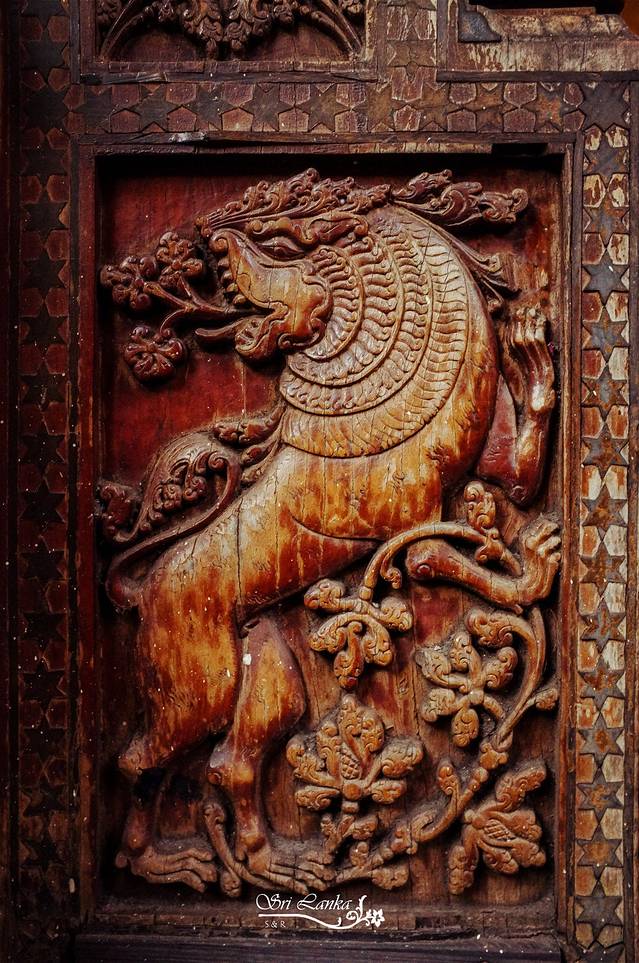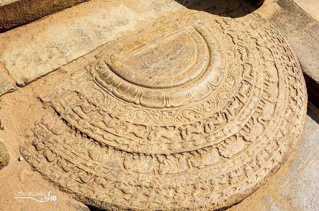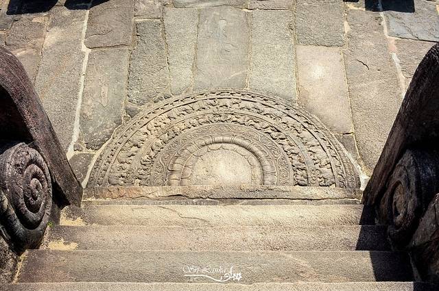 在古城寺庙入口处的台阶底部,我们可一看到一块块刻着浮雕的半圆形石板,这便是传说中的月亮石(Sandakada Pahana)。石板上的浮雕由许多同心的圆环构成。最中心刻的是佛教的经典象征——莲花。接下来几圈由各种图案装饰,制式不一。有代表智慧的天鹅,有象征欲望的火焰,还有大象、狮子、马和牛四种动物。圆环中的动物首尾相连,构成了相互追的图案,寓意着佛教中永无止境的轮回。石板上的浮雕精美绝伦,动物的形态栩栩如生,王国当年的艺术水准可见一斑。