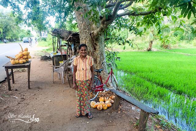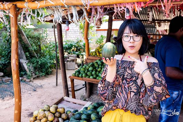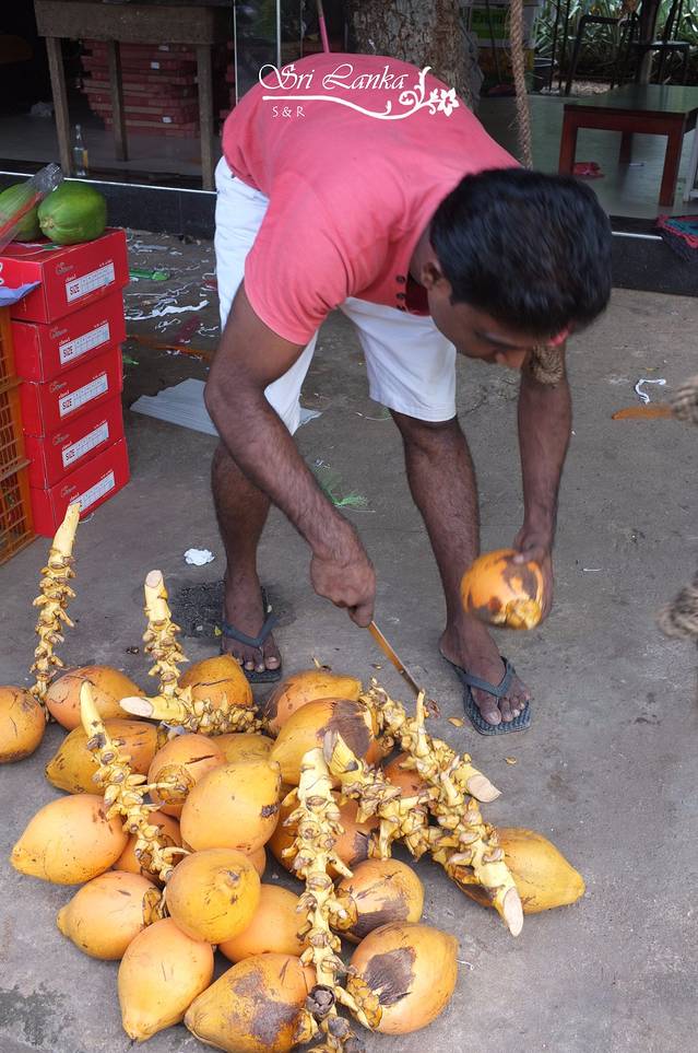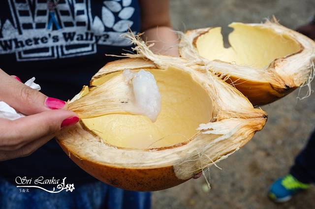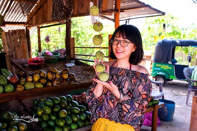 路上聊起斯里兰卡的当季水果,Kani给我们推荐了黄金椰子。恰好路过一档水果摊,Kani果断停车,帮我们问好了价格,让店家开好。50卢比一个,折合人民币2.5元,实在没有讨价还价的必要。黄金椰子的个头比国内常见的青椰要小,底部略尖,但椰汁清甜的口感似乎并没有什么两样。