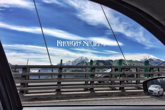 出了大麻扎景区时间还早,霍尔果斯口岸又很近(约20公里),于是乎我们就慢慢悠悠地在路上开着,图中偶遇远处的雪山(上图中背景并不是云而是雪山),就一路朝着雪山开了过去。