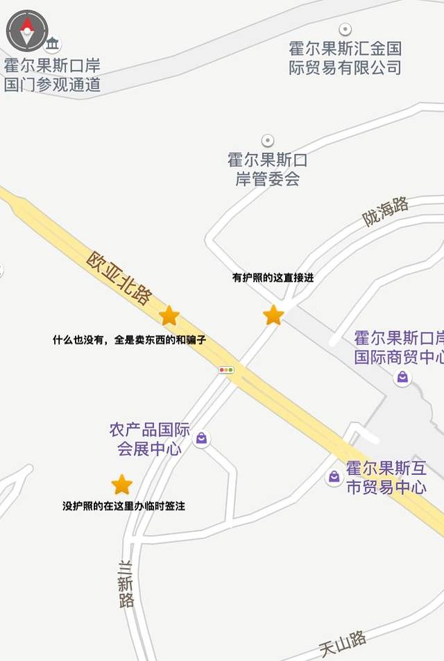 对于霍尔果斯口岸的参观需要提醒的是,从欧亚北路和陇海路的交叉口再往西北方向不是旅游参观的方向,那边有很多骗子号称要带你穿越国境线去到对面哈国,还有很多卖假货的,不必前往。真正需要的是正北方向和西南方向的两个五角星,正北方向的五角星针对有护照的同学,持护照可直接过关进入边贸区,十分快捷。而没有护照的同学就比较惨了,需要到西南方向的五角星去办理临时签注,特别提醒:在此处等待办理临时签注的人简直是要命的多,建议没有护照的同学们一定在家乡办理好护照再来,如果实在没有或忘记了,那务必六点前来此排队。