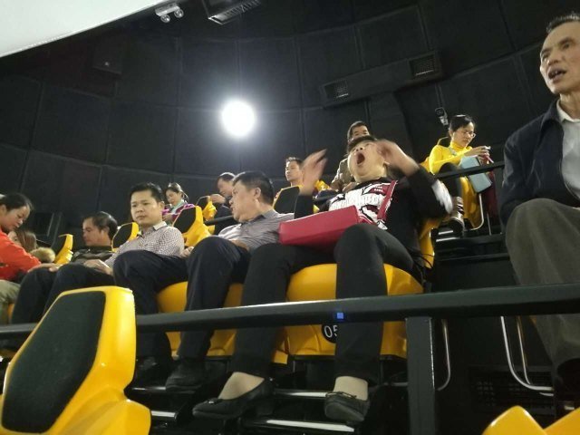这个是球幕电影哦,脸面是360度的屏幕和动感的座椅,在里面看极速赛程,爽到爆!