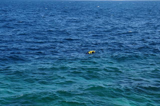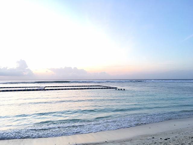 从Sand Gate Inn出门左拐50米,再右拐到底就是一大片的公共沙滩(鬼使神差似地凭着第六感就走到了),不远的深海处还有个用浮栏围起来的天然开放泳池;对于我俩这种土生土长的土包魔都人来说,在看到白沙滩的瞬间就激high了,不顾一切地甩了人字拖,丫丫吼着直奔着海里浪去了