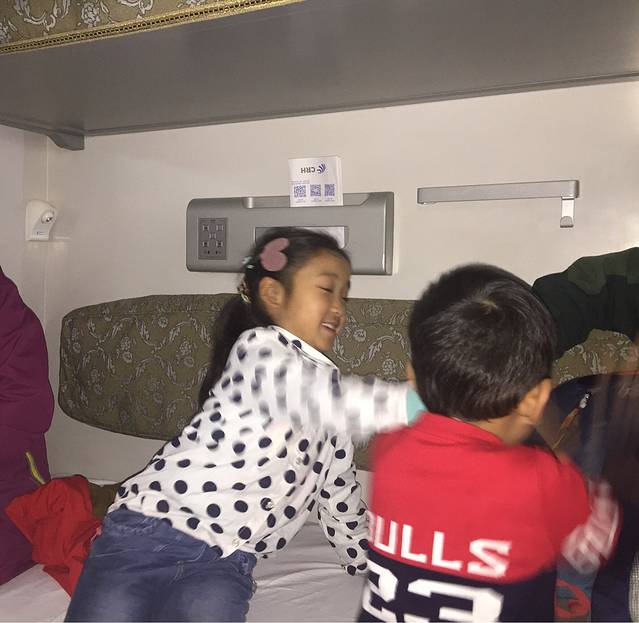今天是春运第一天返乡人多,前一天晚上手机订好票,9点45发车10点40到广州南站。二等座成人70元,1.2-1.5米儿童半价,网上大人可选坐,小孩随机安排的,结果三个成人是39排abc,大宝却是37c。上了火车才知道是软卧车厢代二等座。37-40四张卧铺床在一个小屋里,38和40排是上铺不卖票,37ab都没人,我们一家五口包间了😁👏🏻。