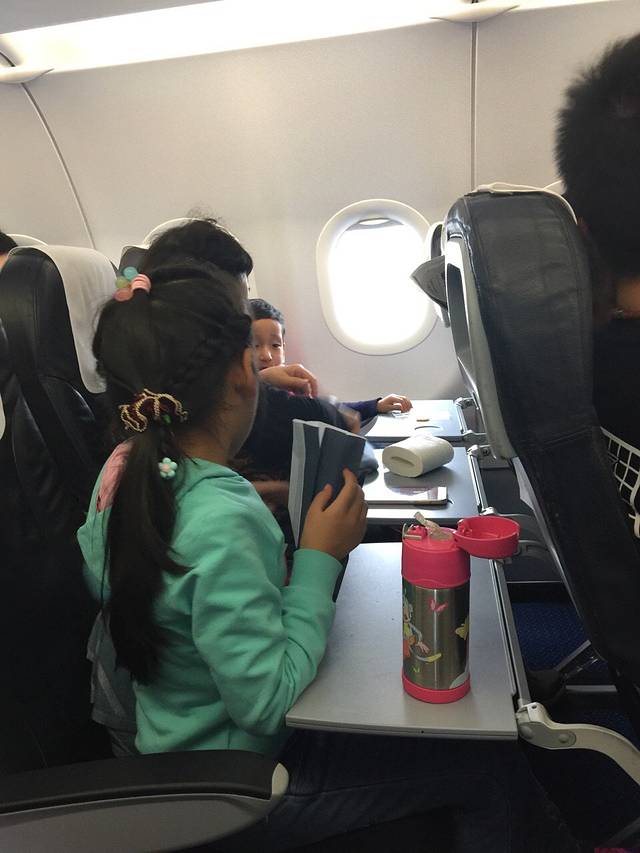 带小点的孩子和头等舱一样享受优先登机,忙着放行李没时间管互相吐口水的俩宝,旁边的空帅同情的问宝妈带两个孩子出来玩很辛苦吧。你说呢!