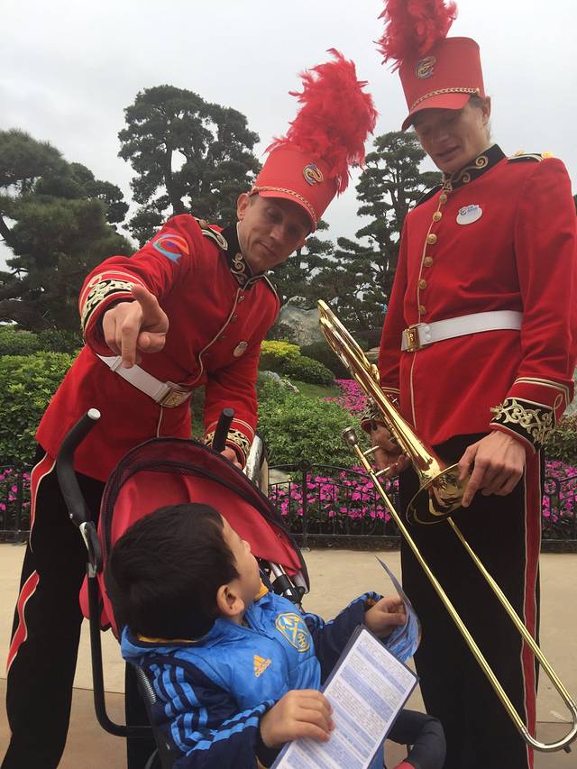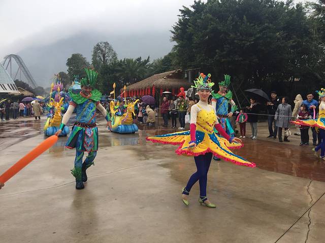 今天早起二宝状态真的很好,奶奶想休一天,攒足体力去港澳,于是我们一家四口早早启程。番禺今天天气格外给力,晴朗无风还凉爽,简直就是完美。亚特兰酒店可以提前预约第二天的送园班车,我们坐最早一班9点的车5分钟就到了北门。在售票处自助机换了票,排会儿队,9点半开园进门。排队时也不寂寞,会有人偶和孔雀公主陪小朋友们照相。售票处成人平日250,周末节假日300,1米至1米5的儿童175和210。我提前一天在去哪儿网app订的成人220,大宝没优惠一个价,二宝不用票。