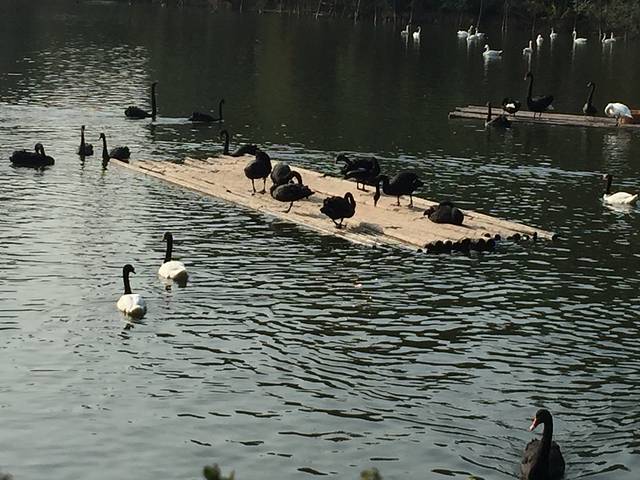 取完地图直奔小火车排队处,路过天鹅湖,我给起的名哈,湖面上黑的白的悠哉悠哉的游。我们照了几张像,又用固定在湖边的望远镜瞧了瞧远景,天气好,心情更好。小火车应该10点开,工作人员提前十几分钟放我们进去,好高兴哦!宝妈提前上网查了攻略,都建议先做小火车再步行的顺序比较合理,因为表演大多在步行区中午和下午进行。私家车同小火车一同进园参观,位置在右侧,总是挡着我们,因为大部分猛兽都在右边,不过还好都可以看见,看多看少而已了。私家车好像同成人票价格一样。