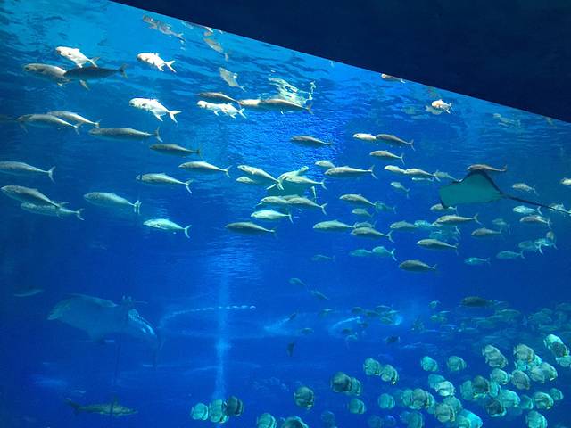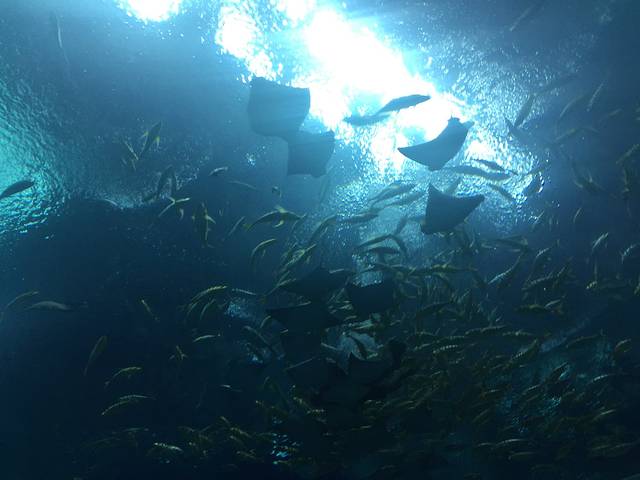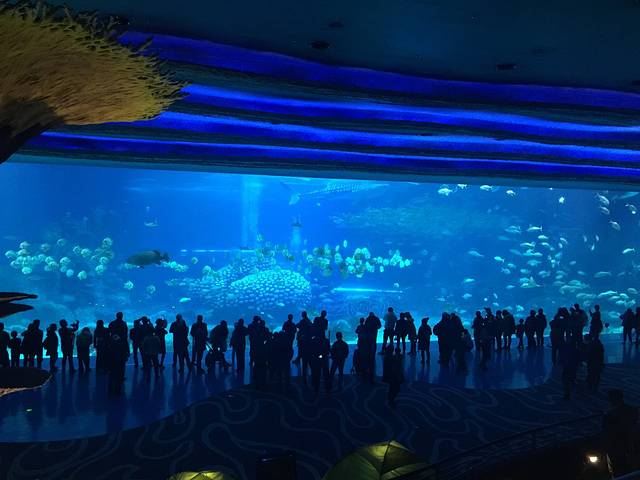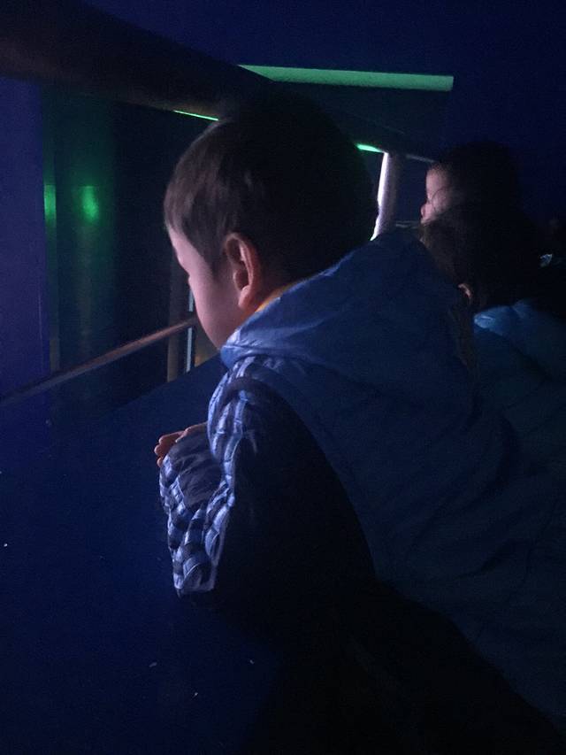 出了5D影院直接来到鲸鲨馆,来的路上简单看了攻略,鲸鲨馆最著名,宝小不能一一玩到就挑最好玩的先来。门前高大的鲨鱼雕塑刚进园区即能远远看到,里面就是人钻到玻璃下面看鱼在上面游。走了一圈11点多到了二宝的吃饭时间,直接进到旁边的海底餐厅。后来宝妈才发现这里是园区里最贵的餐厅😭。