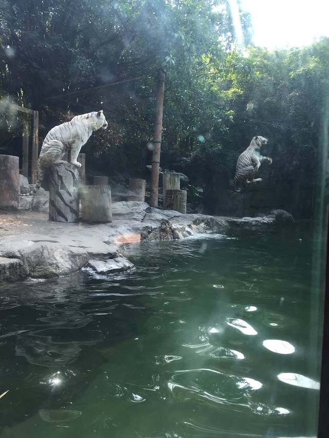 白虎跳水每半小时一场 逢整点半点播出 就是绳上挂块肉电动到水上 白虎想吃就跃起掉到水里 溅起浪花一朵朵