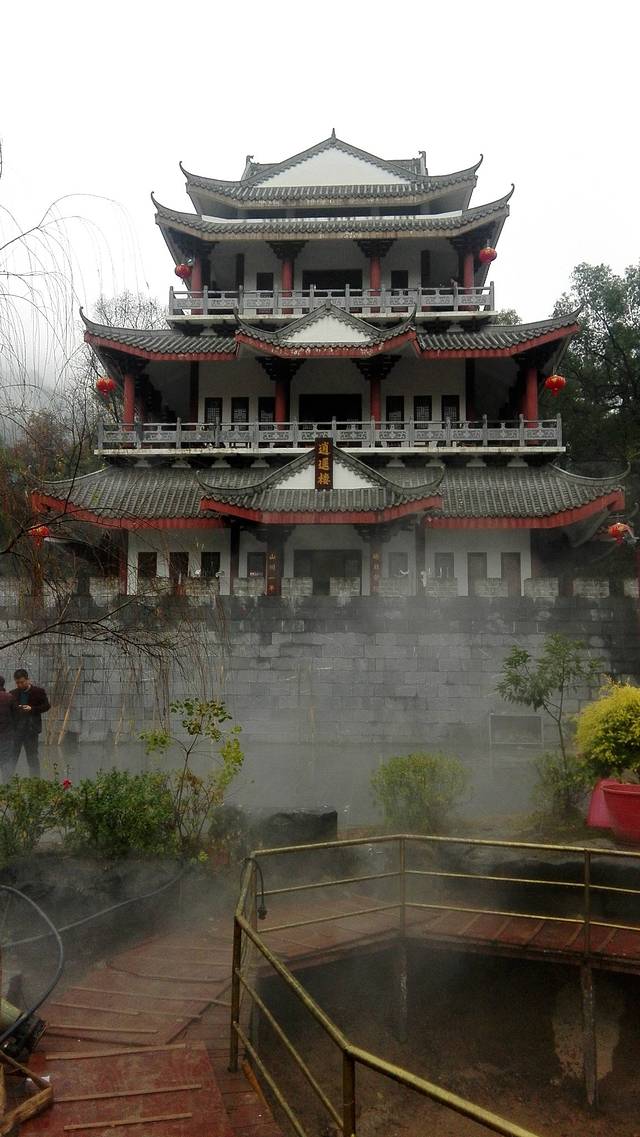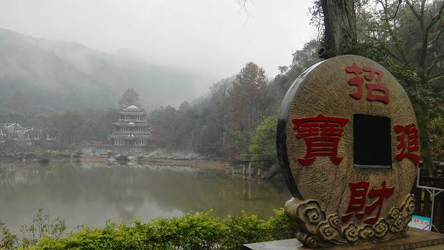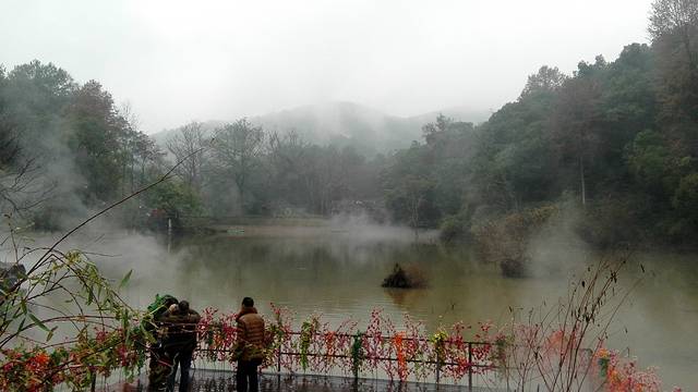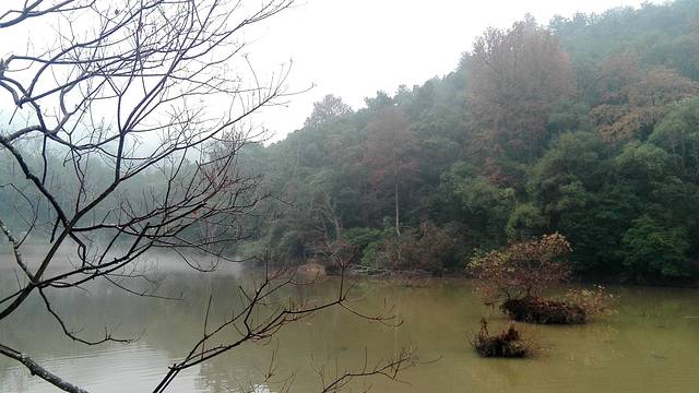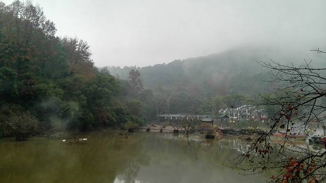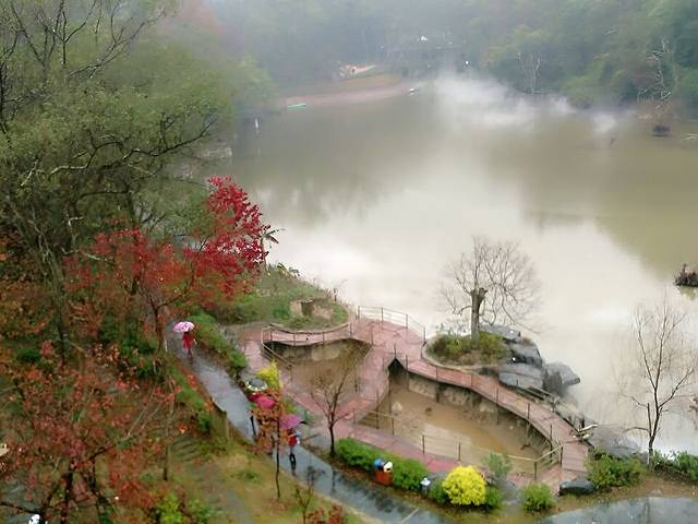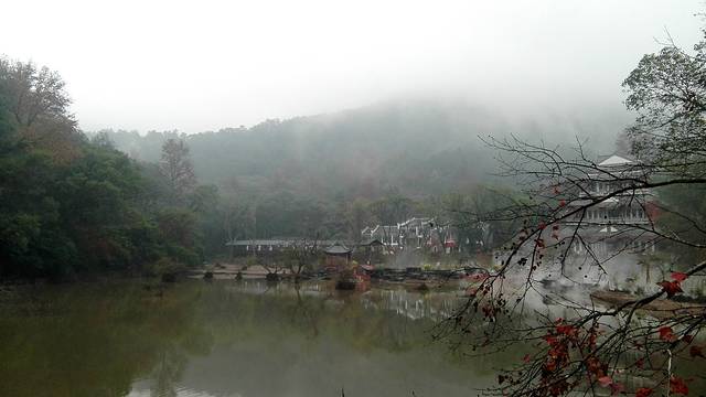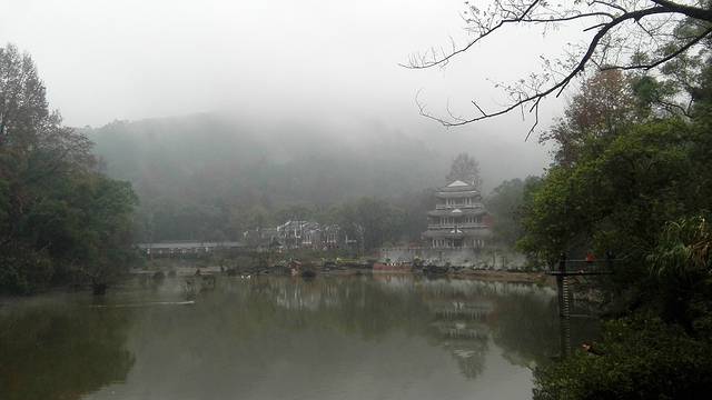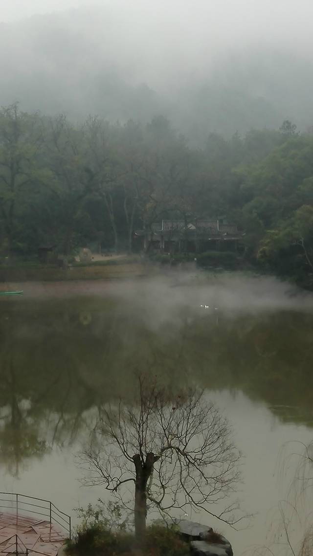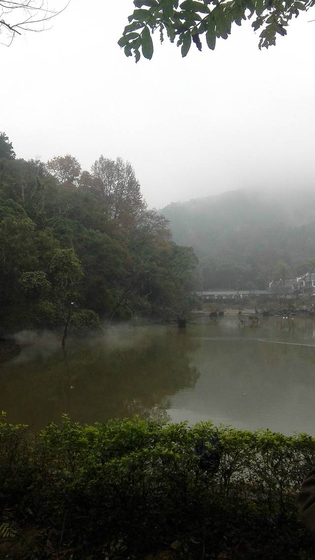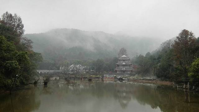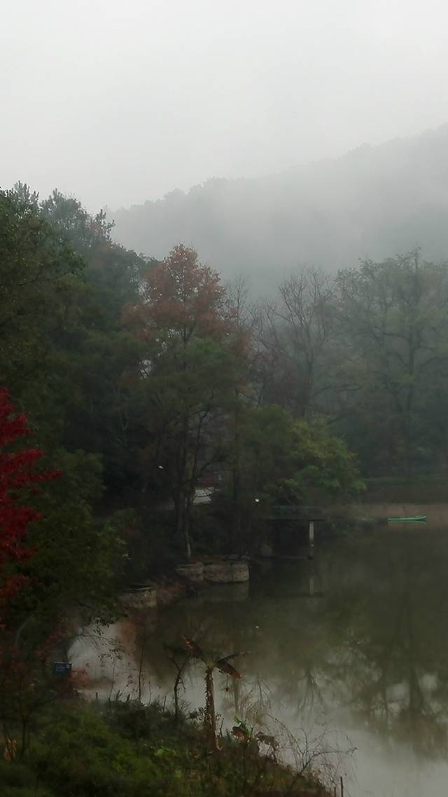 临近逍遥湖,但见群山环抱,一片青绿。山上云雾缭绕,湖中雾气升腾。湖尽头山下,就是逍遥楼。远远望去,真有点雾海仙山的感觉。今天来得真是时候,雨后的水雾,笼罩在山中,朦朦胧胧,更觉得如临仙境。