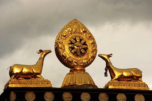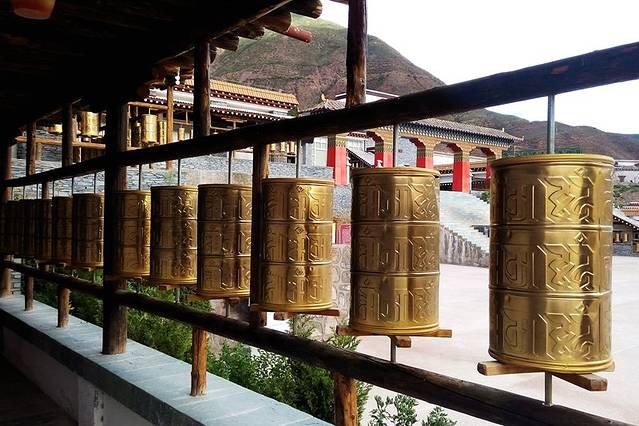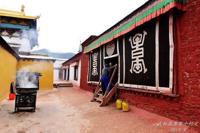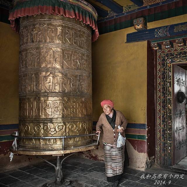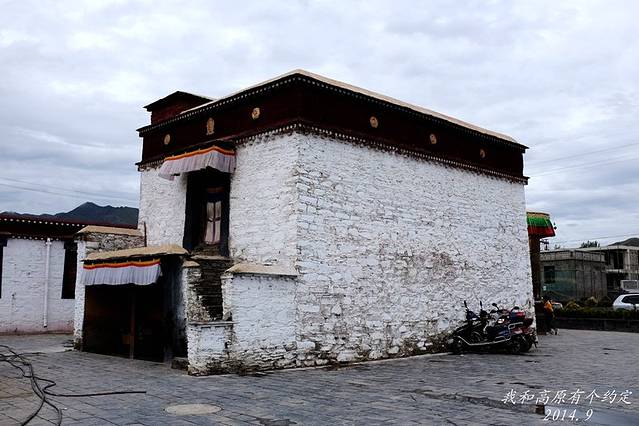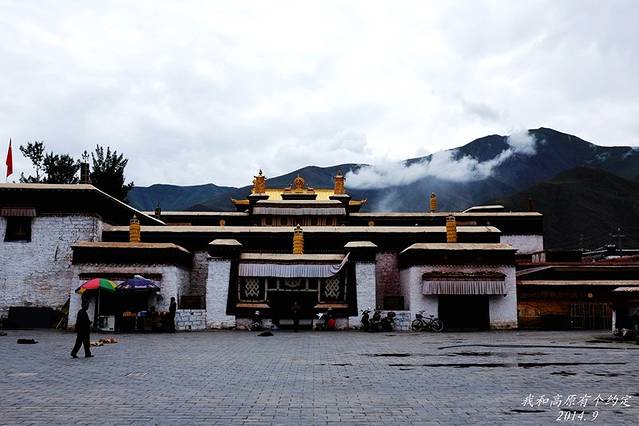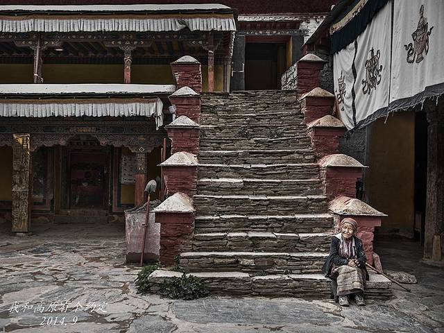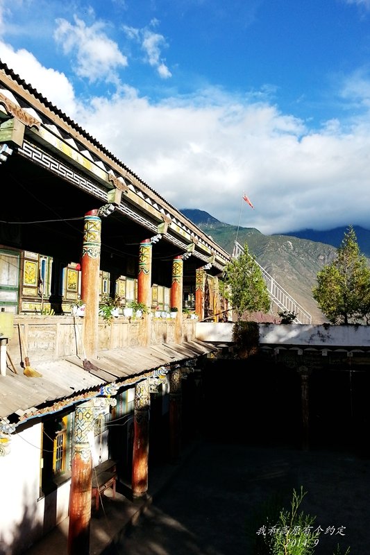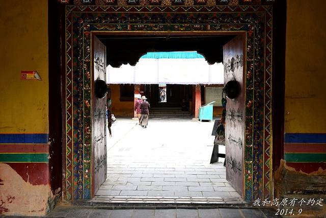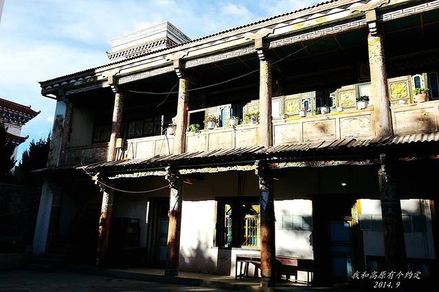 10年前,我和LP、老包也来过这里,那时门、殿都很陈旧,汽车可以直接开到坑坑洼洼的小广场,如今重装后的松赞林寺变得非常宏伟,金碧辉煌。寺内游人很少,我们基本算是今天最后一拨到此的游客了,由一位叫强巴的小导游领着我们慢慢沿着陡峭的台阶拾级而上,回头能看见松赞林寺的“放生池”拉姆央措湖。