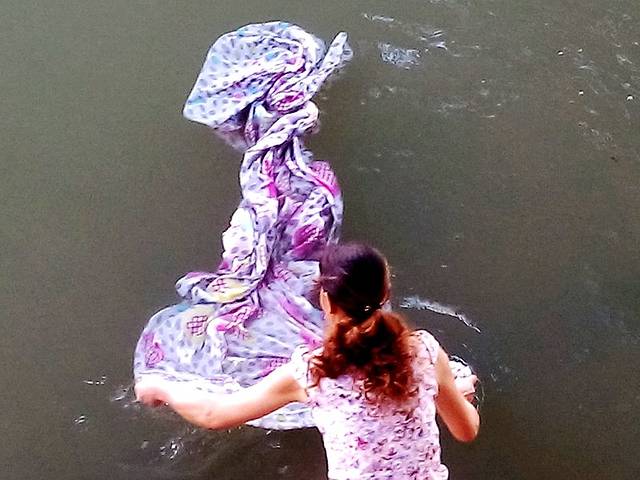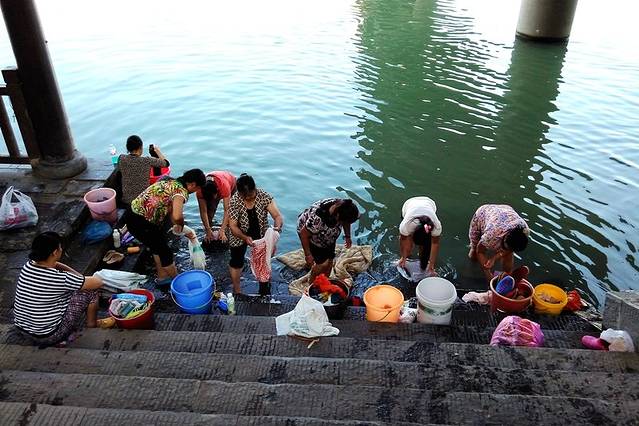 下楼顺着石阶走到河边,吊脚楼下有一条长长的回廊,好些早起的市民已经在那里晨练了,一群大妈、大姐们端着大盆、小盆织物陆续来到河边浣洗,我们一边呼吸着清新空气一边伸展着四肢,似乎也融入到了其中。