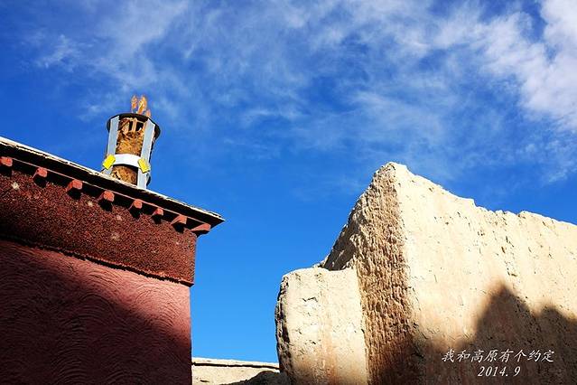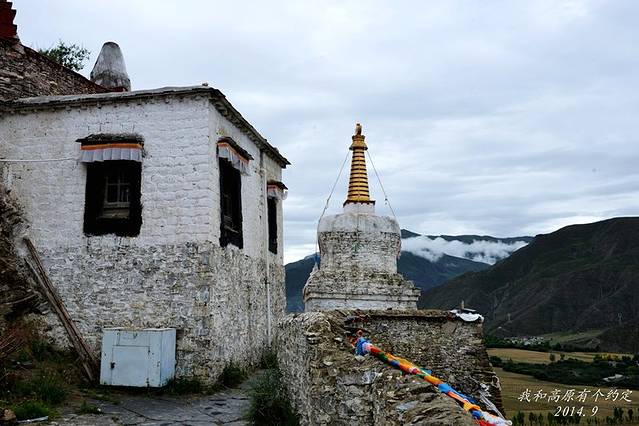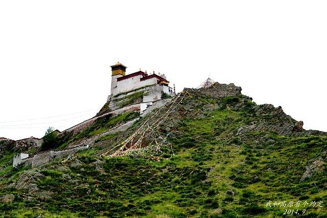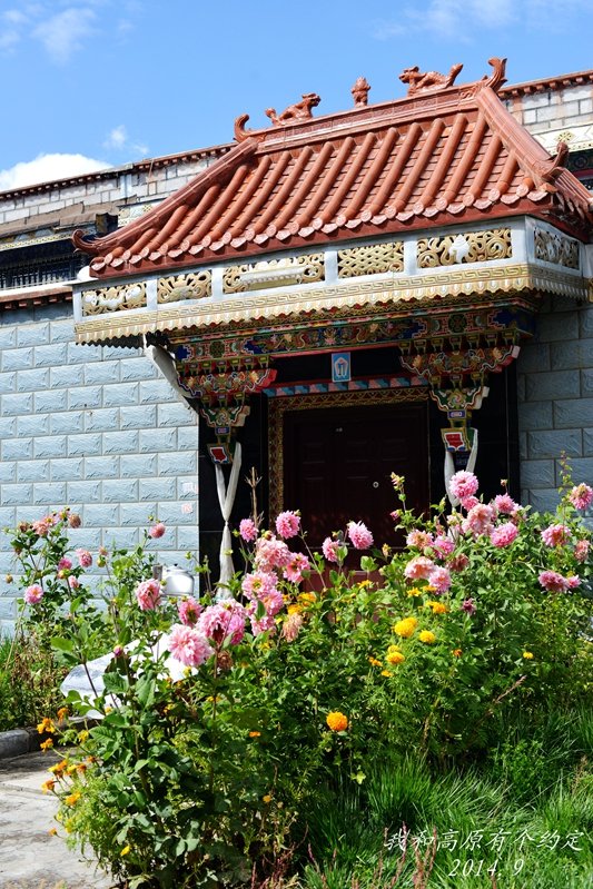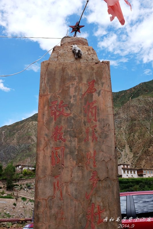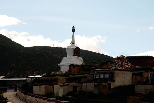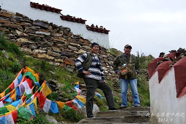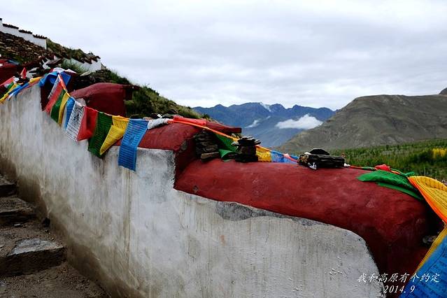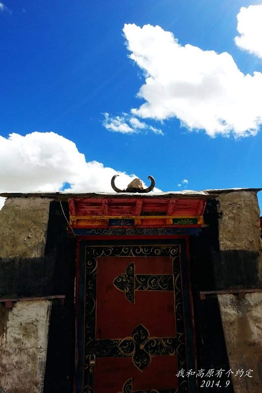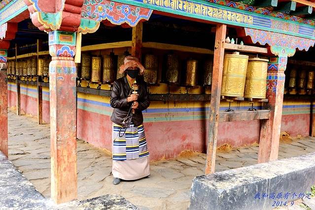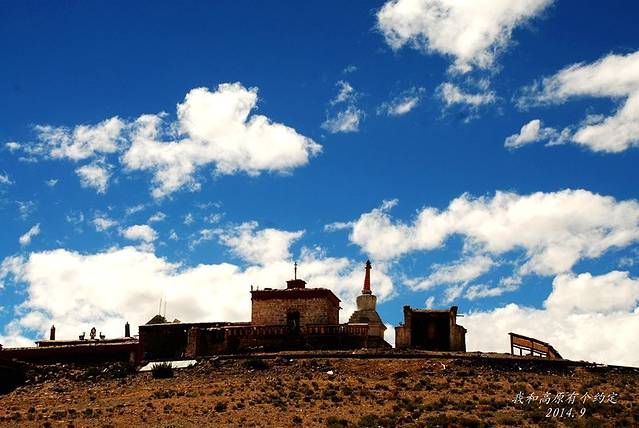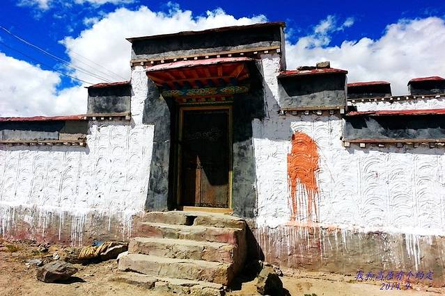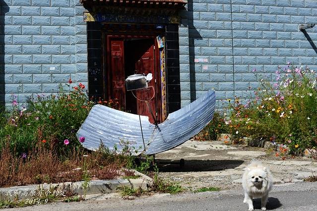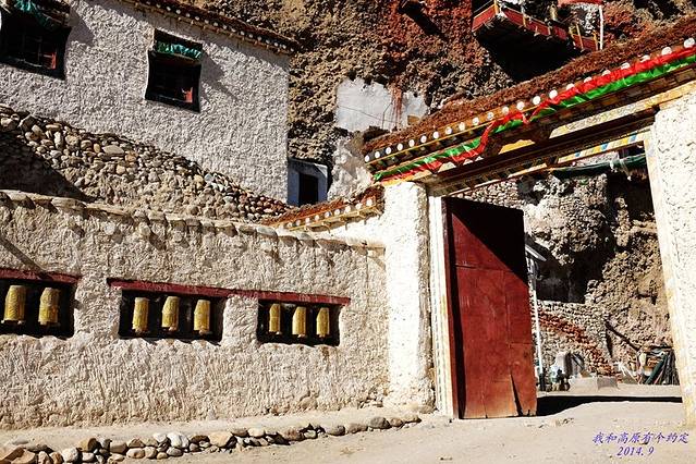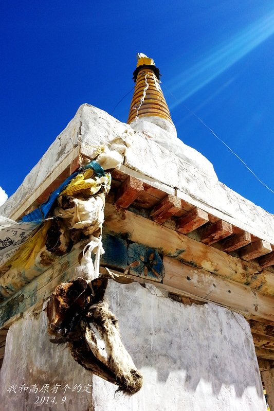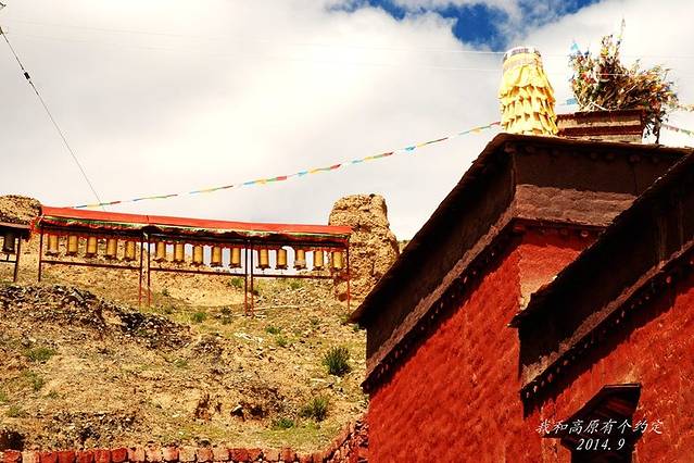 扎东寺是一座很小的寺庙,但是佛塔、经幡、转经廊、大门、主殿一样不缺,五色风马旗从杆顶向四周散发开来,在蓝天白云的背景下翻飞,白色、红褐色、黑色的院墙和镶嵌在墙上的金色转经筒在阳光的照耀下相互辉映。本想再细细品味一番,但路虎车似乎对此没什么兴趣先走了,为了不让他们等待太久,也就粗略看了一下,过客而已。
