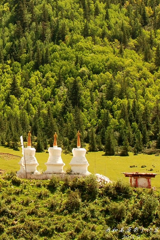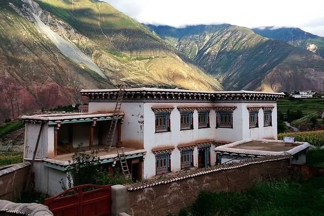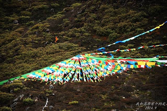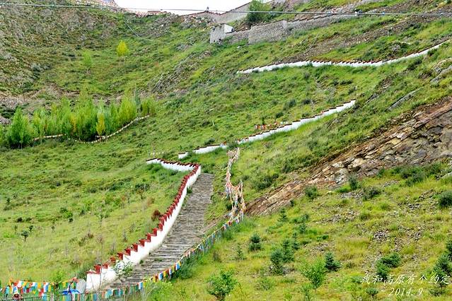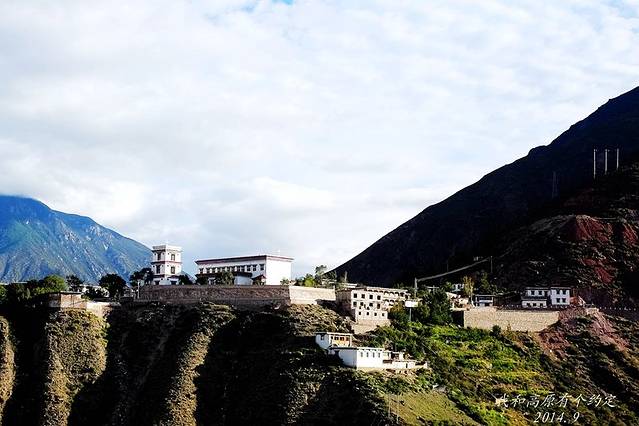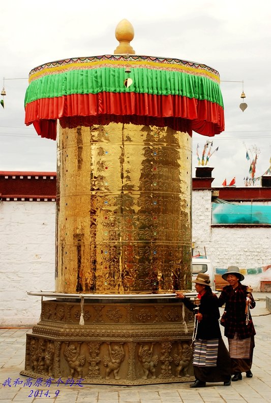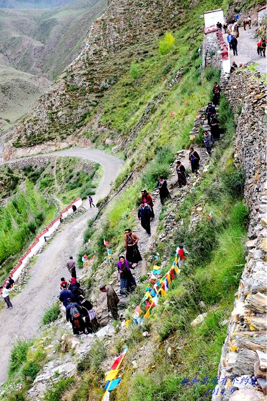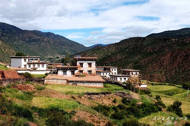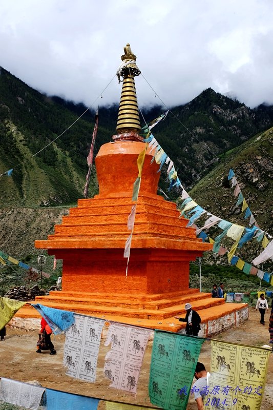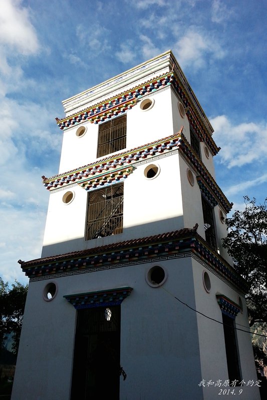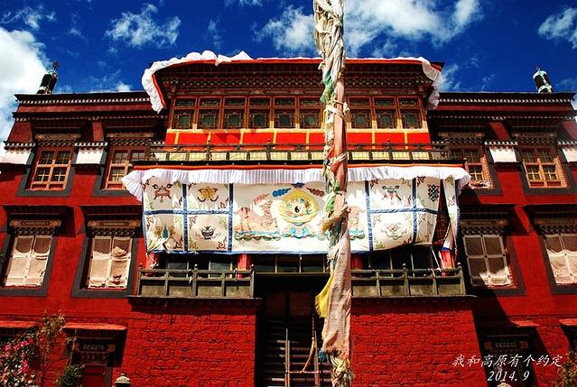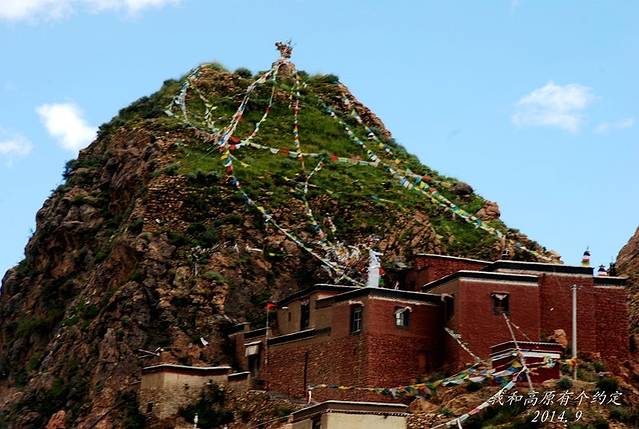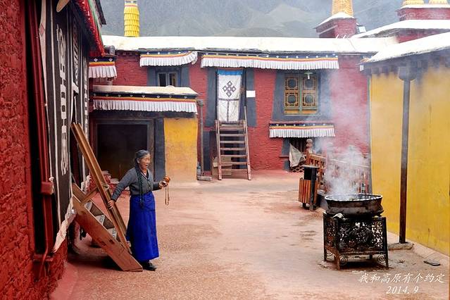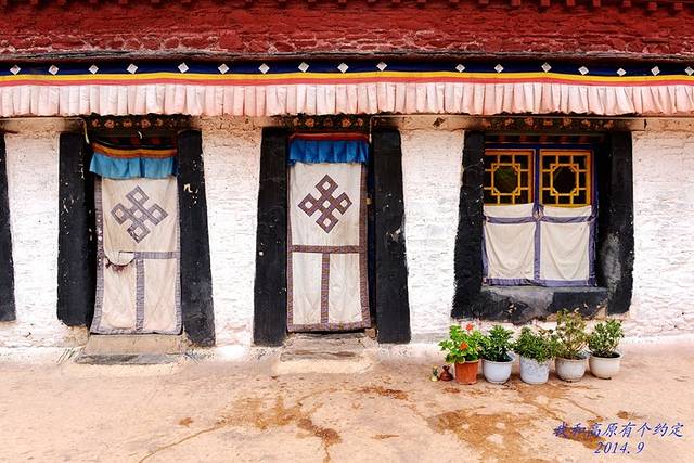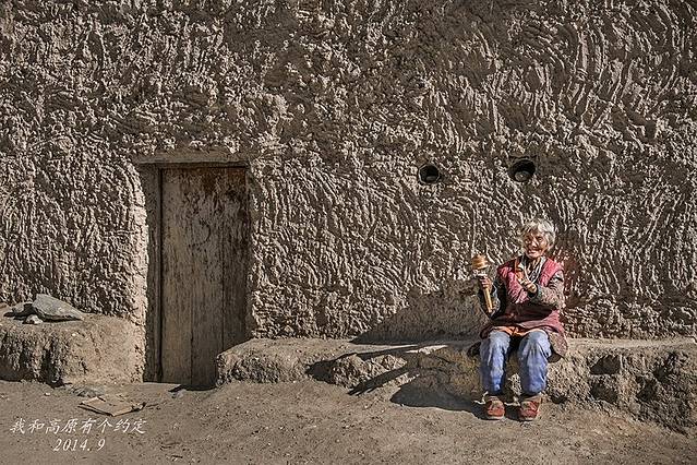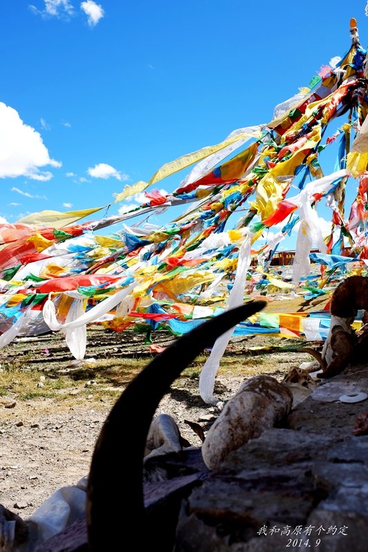 扎东寺是一座很小的寺庙,但是佛塔、经幡、转经廊、大门、主殿一样不缺,五色风马旗从杆顶向四周散发开来,在蓝天白云的背景下翻飞,白色、红褐色、黑色的院墙和镶嵌在墙上的金色转经筒在阳光的照耀下相互辉映。本想再细细品味一番,但路虎车似乎对此没什么兴趣先走了,为了不让他们等待太久,也就粗略看了一下,过客而已。