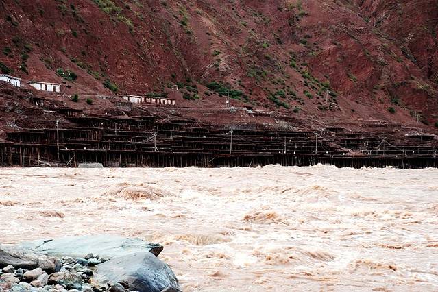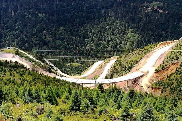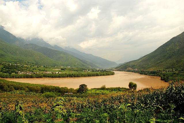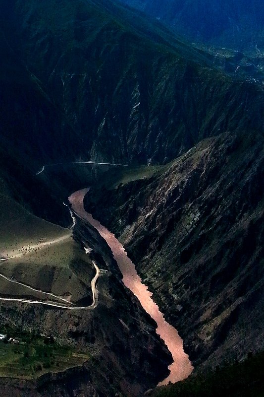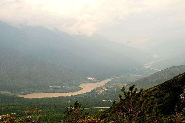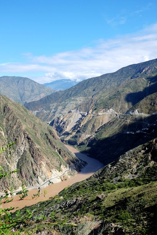 出丽江后在路边买了些水果做为途中维生素的补充,沿着214国道往北上山,路面很好,风景也好。见到一处观景台,可以看到远处有大江。