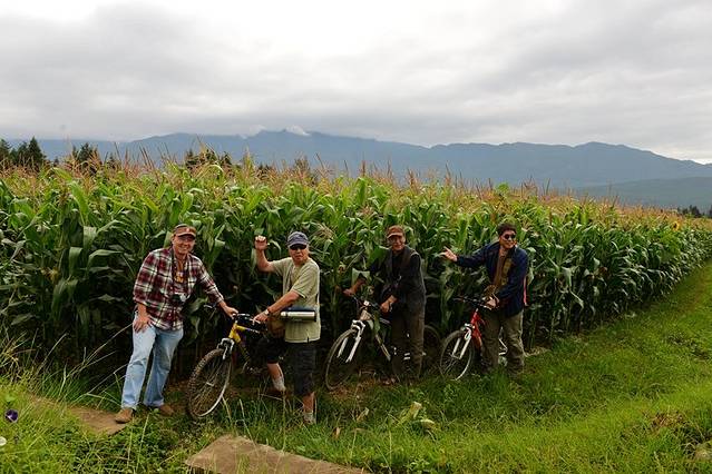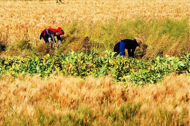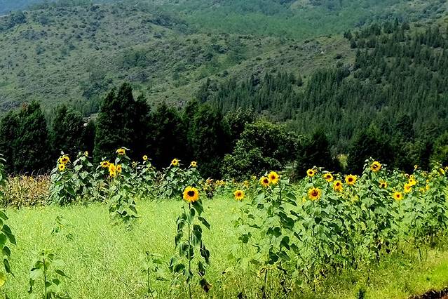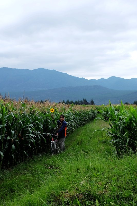 去白沙的路很好走,蓝天白云下所见尽是葱绿的田园、盛开的向日葵和小村庄,更有那不知名的野花迎风摇曳。你可以肆无忌惮地去接近自然,听风响、嗅花香、触摸阳光。在这样的路上骑行真是心旷神怡,享受大自然的恩赐。看见一位漂亮美眉独自一人在拍摄,赶忙请她帮我们拍张合影,顺便也同她合影一张。