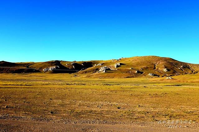 我们的汽车就像一辆月球车在向西探索,追逐阳光。随着太阳的升起,慢慢看清了这片地貌,首先看见的是有着金黄色细沙的沙漠,但这沙漠并不大,而是沿着路边在视线内铺展上一段之后,就又有草原,路边的沙砾已渐渐变细,形成了一些沙丘,短短的小草在上面顽强地生长,给一片枯黄的大地增添了色彩。