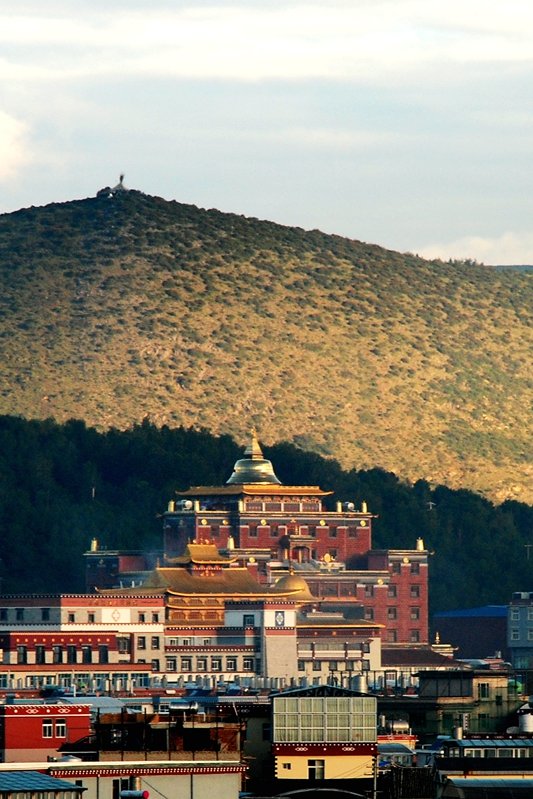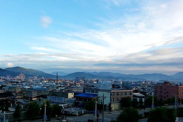 早安 香格里拉。初升的太阳渐渐将香格里拉城区照亮,站在酒店的窗台前就可以俯览整个城区,远处的几座寺院的金顶在阳光下闪现着金光,又是一个好天气,我们要出发了。