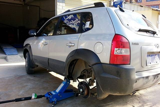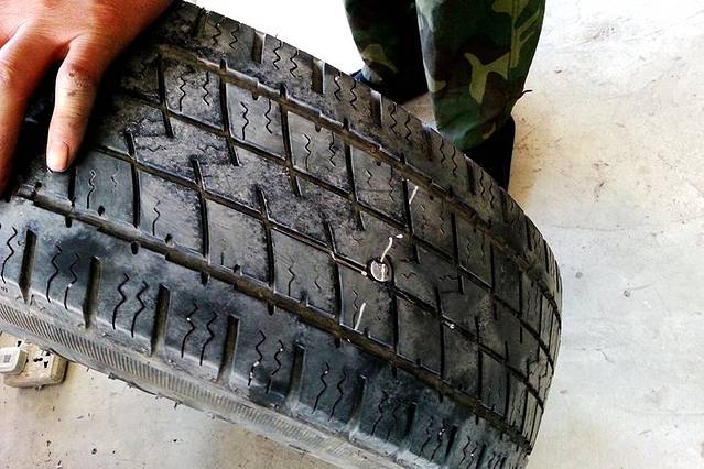 装行李的时候发现车的左后轮有些瘪,想起昨天出发前检查车子觉得轮胎有些不对劲,还对老二说我怎么看都觉得这个轮胎不顺眼,但当时没看出什么问题。找到一家补胎店一检查,出状况了,扎了一根粗壮的减速带钉,并且其它三个胎磨损的也很厉害,先补胎吧。补胎师傅拆下轮胎一看胎壁已经非常薄了,用了两块补胎胶。
