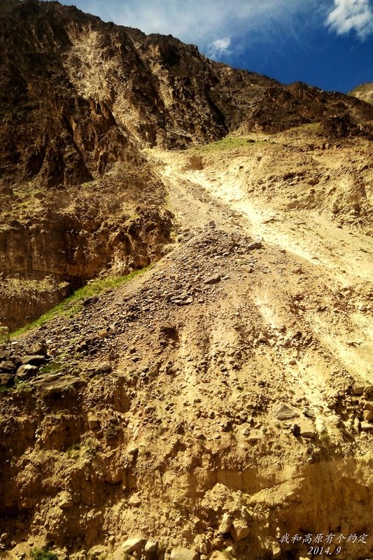 车过兵站后迅速爬上一座不知名的山峰,手机的上的海拔表显示有5100多米。可能是中午的阳光过于强烈,也可能是这座无名山太过陡峭,还可能是眼前所见一切一片荒漠寸草不生,大家都有些疲惫,LP更是有些不耐烦,直问我们到底要去哪儿?看这无边无际的秃山真不想走了。我说LP不要急,那地方我虽没去过,但看过资料非常值得一游,坚持一下,说不定你到那会惊呼的。