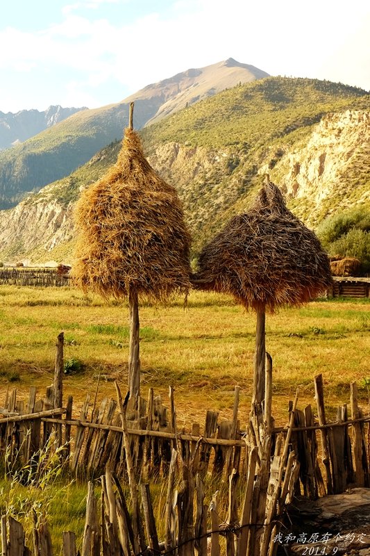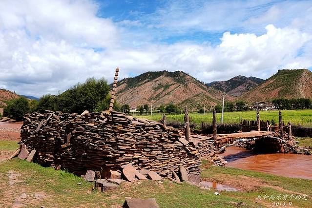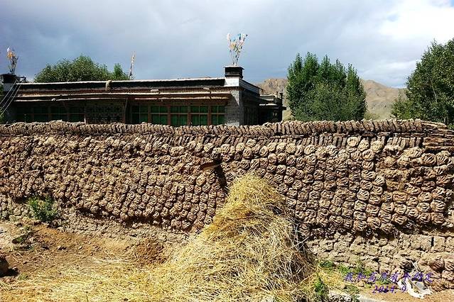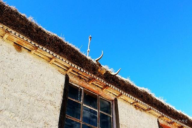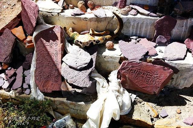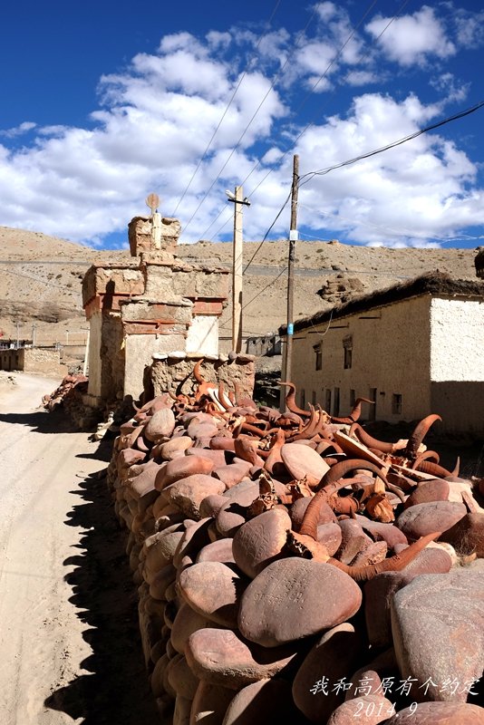 桥头向左急转是条很窄的土路,两边是个藏族村落,这个村落好像没有什么居民,好多房子都是空的,但路边的石墙却是用玛尼石堆砌,上面还安放着许多牛角,看起来挺圣洁。