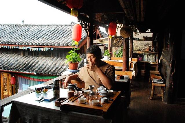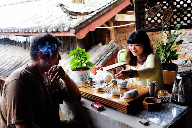 主厨当然非LP莫属,到厨房忙去了。我们和客栈主人小张喝茶聊天。小张是河南人,长得很乖巧,要不是听她说话怎么看都像个南方姑娘。早些年在茶叶店干过,泡茶的姿势很专业。她也是来束河旅游喜欢上了这个地方,一不留神就留下了。一个人撑起这家小客栈真不容易,佩服。咱们的女儿可真不如人家。
