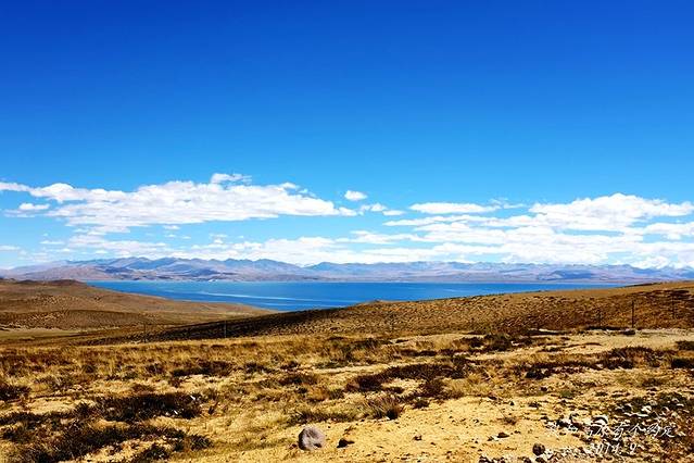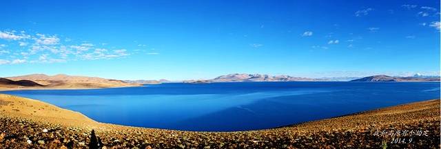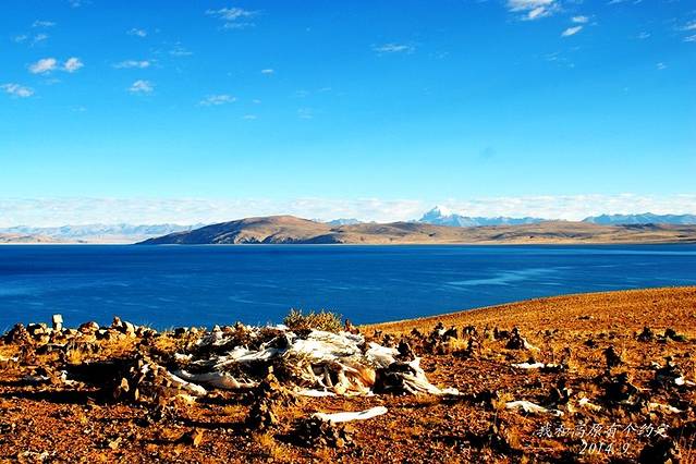 西侧渐渐开阔起来,离开主道有一个不高的土坡,两道深深的车辙在土坡上划出一道完美的曲线,我们顺着它开到尽头,这里是一个陡峭的断崖,一幅绝美的画面展现在眼前。“鬼湖”拉昂措一改昨日诡异的面容,平静的没有一丝波澜,像一块深蓝的绒毯与天同色,若不是远方山脉形成的地平线,你甚至分不清究竟是在地还是在天。